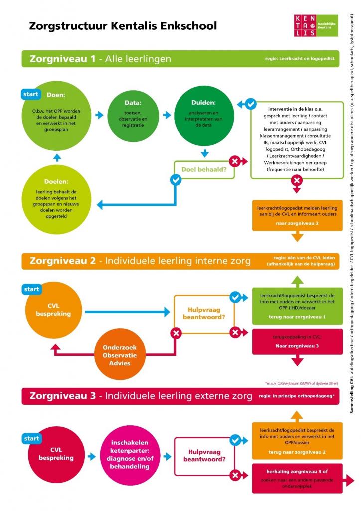 De leerlingen worden in de groep begeleid door de leerkracht, logopedist en assistent. Ze werken daarbij handelingsgericht en opbrengstgericht. Op de unit werken een orthopedagoog en een intern begeleider. Samen met de groepsleiding volgen zij de ontwikkeling van de leerlingen. In onderstaande afbeelding wordt de zorgstructuur van de Enkschool schematisch weergegeven.